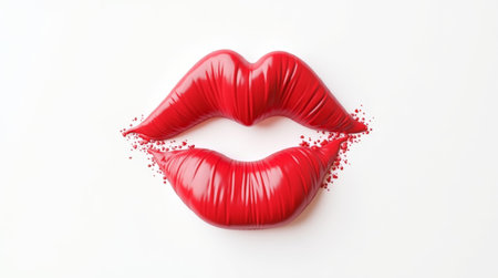 Realistic 3D image of glossy red lips with splash elements on white background. Minimalist composition, for beauty, fashion, cosmetics and sensual concept themes