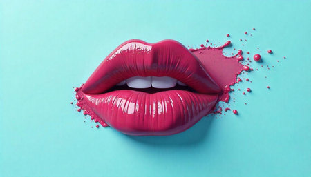 Glossy pink lips with paint splash on turquoise background