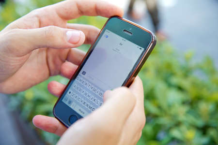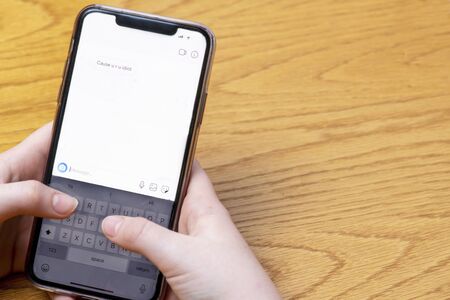 Close up of female hands holding mobile phone exchanging text messages.