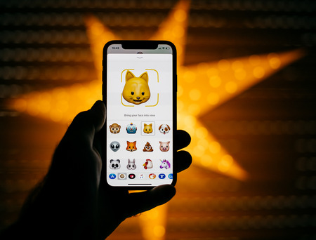 PARIS, FRANCE - NOV 10 2017: Cat 3d Animoji emoji generated by Face ID facial recognition system with different face emotion close-up of the new Apple iPhone X 10 Display - yellow star bokeh background