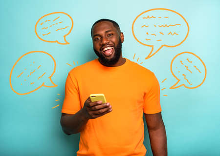 Happy man is happy with a yellow mobile phone in hand