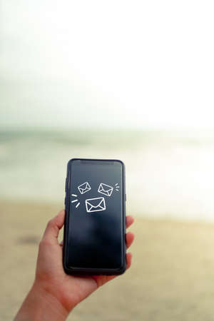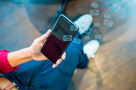 Woman hand using smartphone to send and recieve email. Business communication technology concept.