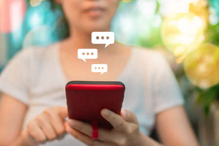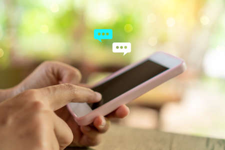Woman hand using smartphone with chat icon background. Business communication social network concept.