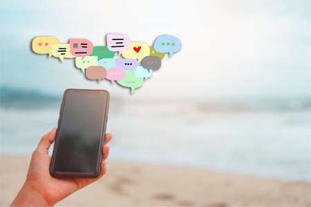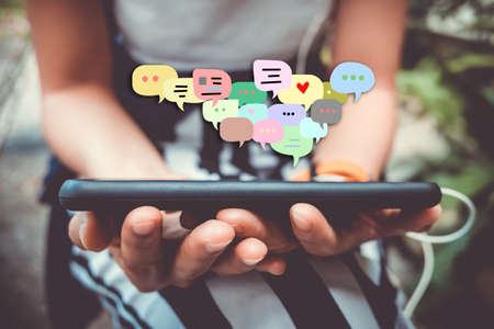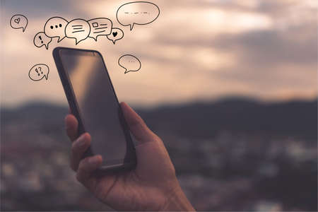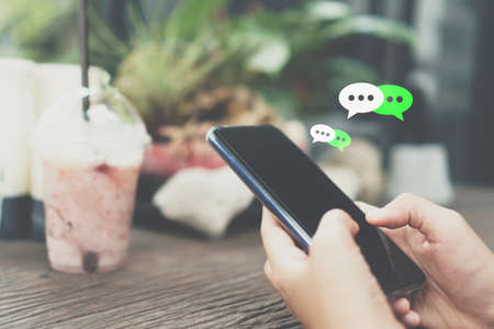 People hand using smartphone typing, chatting or text messages in chat icons pop up. Social media maketing technology concept. Vintage soft color tone background.