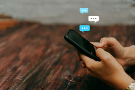 Women hand using smartphone typing, chatting conversation in chat box icons pop up.