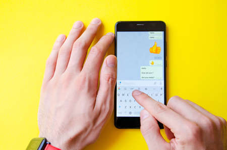 A male hand holds a smartphone, points a finger, types. Communication on a smartphone, correspondence. Place for text. Smartphone in hand on a yellow background.