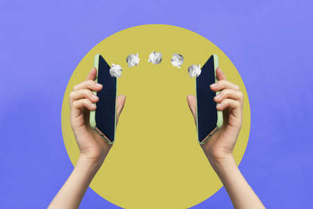Creative banner poster of two palms hold smart gadgets transmit paper bank service e commerce isolated color background