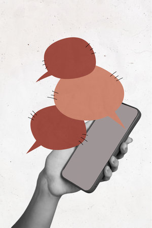 Vertical creative magazine collage of hand hold phone discussion correspondence chat distance text box internet online gadget isolated on white background