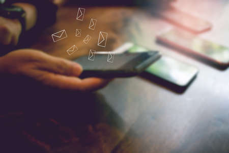 Blur. newsletter concept Hand of businessman checking message box on mobile phone