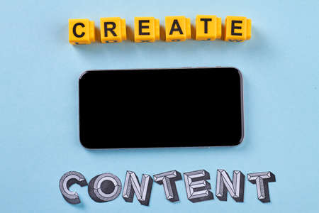 Flat lay smartphone and create content words. Isolated on blue background.