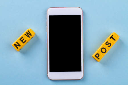 Flat lay new post concept on blue background. Close up turned-off smartphone with white frame.