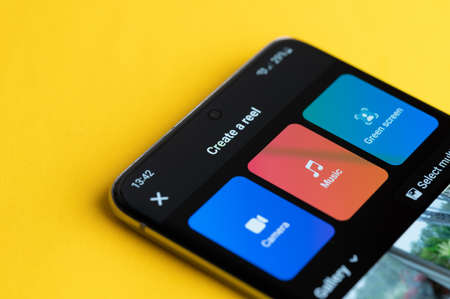 New york, USA - june 21, 2022: Create facebook reel on smartphone screen close up view