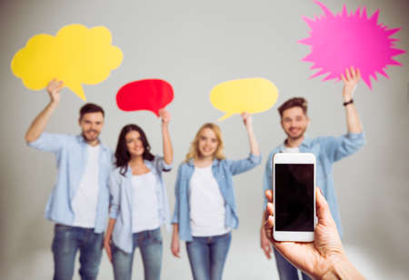 Hand with a smartphone, in the background young people are holding colorful speech bubbles and smiling, standing on a gray background
