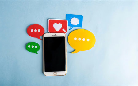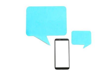 Internet communication. Mockup smartphone screen and blue chat icons above isolated on white background. Copy space.