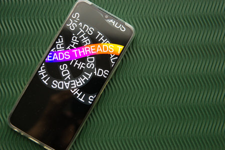 Tver, Russia - July 15, 2023, threads logo on the smartphone screen, on a green background. The threads icon. The logo of the current application. Threads social network.