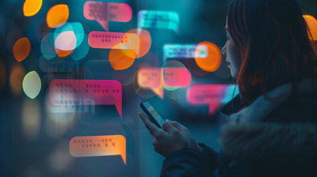 A woman texting on a mobile phone at night, with abstract glowing digital chat bubbles and colorful bokeh lights.