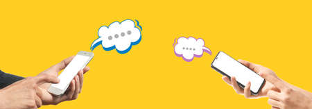 People with mobile phones chatting online against yellow background