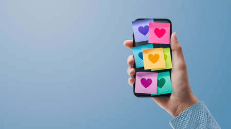 Woman holding a smartphone and lots of sticky notes with hearts on the display, relationships and communication concept, POV shot