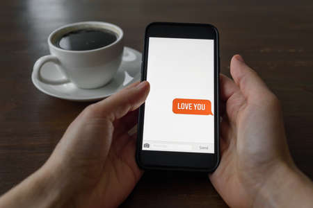 Hand holding phone with love valentine message from partner. Cup of coffee on table