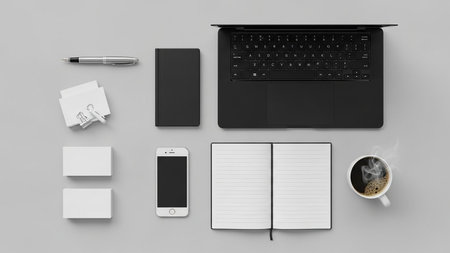 Top view of modern office desk with copy space, smartphone, laptop, coffee cup and supplies