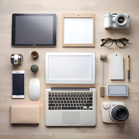 Top view of digital devices on worktable with mock up tablet, smartphone, camera and stationery