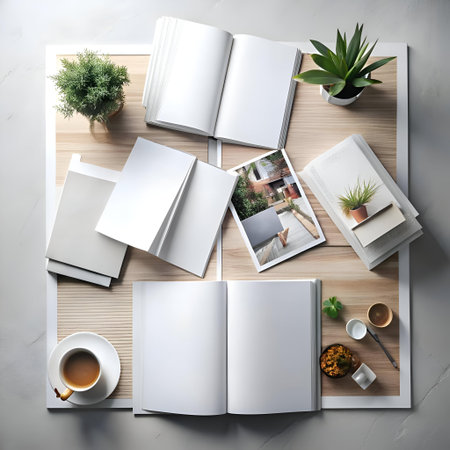 Top view of marble worktable with mock up tablet, smartphone, books and copy space