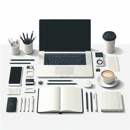 Minimalist workspace with laptop headphones coffee and notebook on white background. concept of modern work setup clean desk organization technology.