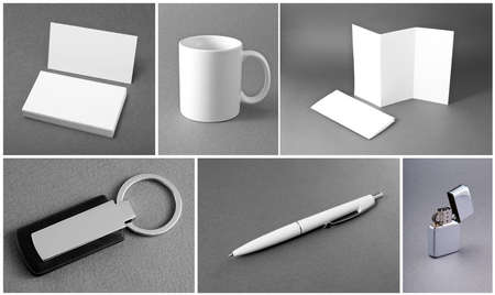 Blank business cards, pencils, coffee cups and clips on concrete background. corporate identity template.