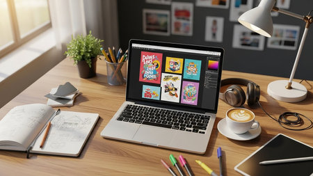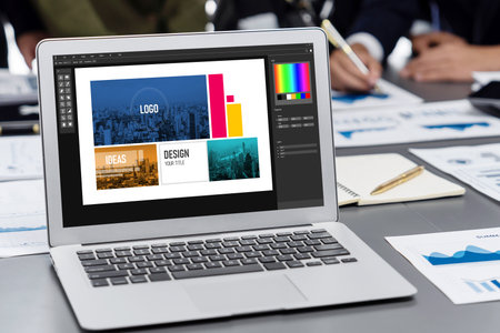 Graphic designer software for modern design of web page and commercial brisk ads showing on the computer screen