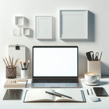 Mockup laptop with blank screen, stationery and coffee cup on white wall.
