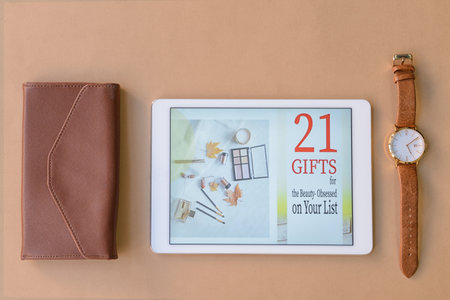 Devices or gadgets with copyspace for ad - mockup, digital concept. Office or co-working location with highly digital workplace with tablet, cards and leaves. Online work, shopping, service concept.