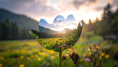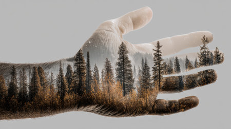 Creative representation of hand with forest landscape overlay, symbolizing connection between nature and humanity. image evokes sense of tranquility and harmony with environment