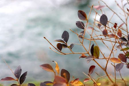 Close up of a different colored leaves in autumn. Blur orange bokeh background