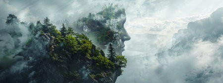 A surreal composition featuring a human face blended into a mountainous landscape covered with trees and clouds, creating a dreamlike and artistic visual metaphor of nature and humanity.