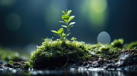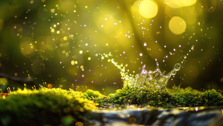 Splashing water on green moss in a serene forest setting, illuminated by warm sunlight and soft bokeh effects