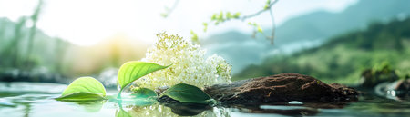 Gentle water cascades over rocks in a serene stream, surrounded by lush greenery and delicate flowers, as morning mist envelops the forest, creating a peaceful atmosphere.