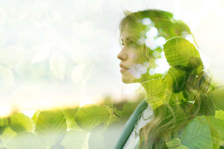 The closeup double exposure picture between young adult beautiful female caucasian human and bright beautiful nature in the morning or evening that the picture stand for peaceful of the life. AIGX01.