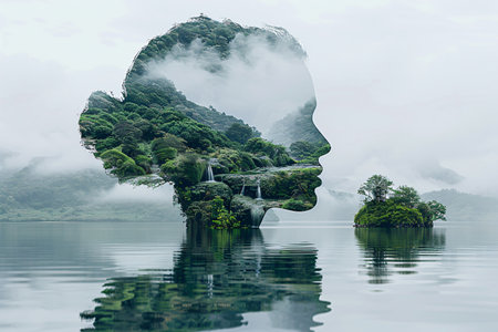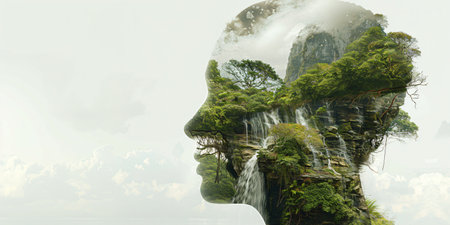 A conceptual image featuring a calm silhouette of a human face filled with a lush green forest landscape. High quality photo
