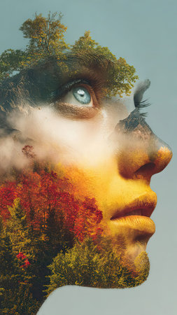 Double exposure portrait of a beautiful woman with autumn forest in the background.