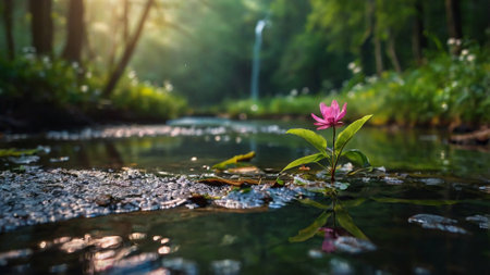 A solitary flower bravely blooms on a rocky island, bathed in the golden light of a serene dawn The still lake reflects the peaceful sunrise, creating a sense of tranquility and new beginnings The landscape evokes a fresh start, where hope and optimism blossom with the emerging day AI Generative