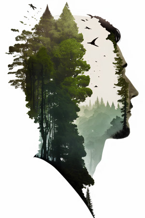 A conceptual image featuring a calm silhouette of a human face filled with a lush green forest landscape. High quality photo