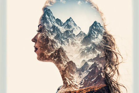 A double exposure showing a womans face superimposed with a mountainous landscape in the background. The womans features blend seamlessly with the rugged outlines of the mountains.