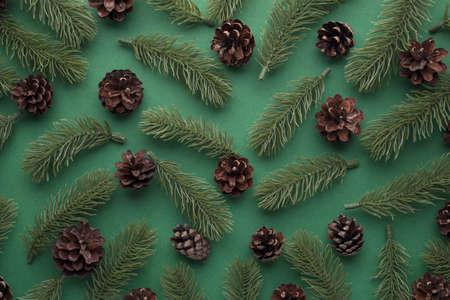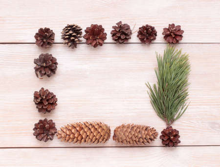 Christmas concept. flat lay fir branches, sequoia cones on wooden background