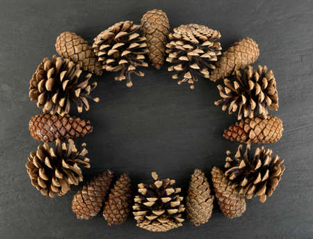 Pinus pinea, stone pine cone. Brown italian pine cone in christmas composition. Copy space