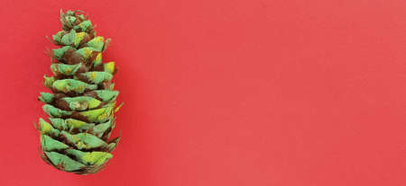 a beautiful pine cone colored green and decorated with gold sequins on a red background. Copy space. Christmas cone. Spruce cone on the left.