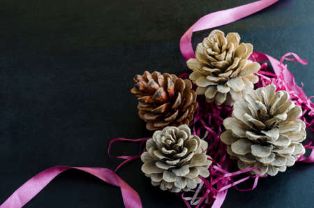 Christmas festive background. Multicolored pine cones and pink ribbon on black background. Festive mood. Copy space.