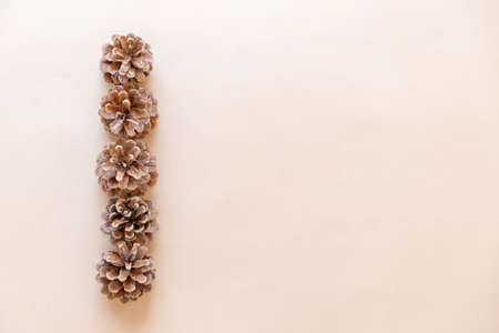 A simple composition of pine cones on a beige background. space for text. Greeting card, invitation card concept
