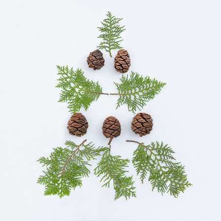 Christmas holiday concept as a flat lay with fir tree cones on white background
