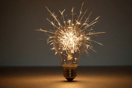 A person holds a glowing light bulb that emits sparks, symbolizing excitement and creativity in an indoor environment.