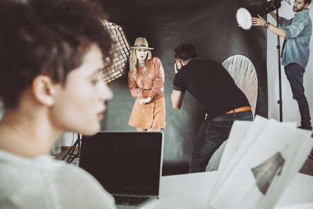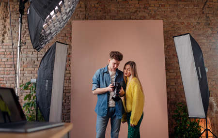 Young photographer showing picures to model, backstage of photoshooting in studio.